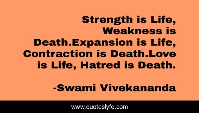 This page presents the quote "Strength is Life, Weakness is Death.Expansion is Life, Contraction is Death.Love is Life, Hatred is Death.". Author of this quote is Swami Vivekananda. This quote is about enthusiasm, inspirational,.