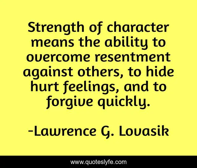 This page presents the quote "Strength of character means the ability to overcome resentment against others, to hide hurt feelings, and to forgive quickly.". Author of this quote is Lawrence G. Lovasik. This quote is about strength, character, personality,.