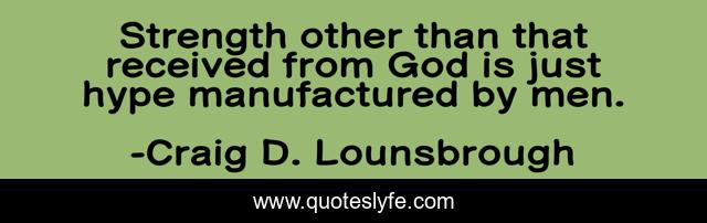This page presents the quote "Strength other than that received from God is just hype manufactured by men.". Author of this quote is Craig D. Lounsbrough. This quote is about jesus-christ, manufacture, empowerment, strength, deception, exaggerate, exaggerated, god, create,.