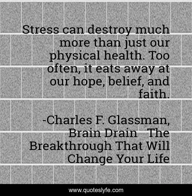 This page presents the quote "Stress can destroy much more than just our physical health. Too often, it eats away at our hope, belief, and faith.". Author of this quote is Charles F. Glassman, Brain Drain The Breakthrough That Will Change Your Life. This quote is about faith, stress, belief, inspirational, enthusiasm,.
