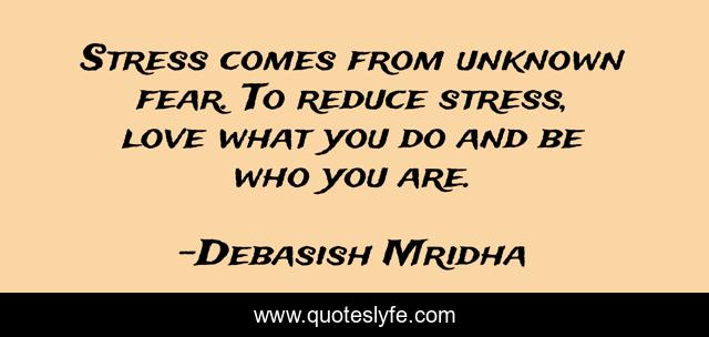 This page presents the quote "Stress comes from unknown fear. To reduce stress, love what you do and be who you are.". Author of this quote is Debasish Mridha. This quote is about be-who-you-are, philosophy, debasish-mridha, where-does-stress-come-from, quotes, what-causes-stress, debasish-mridha-md, inspirational, stress-comes-from-unknown-fear,.