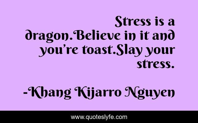 This page presents the quote "Stress is a dragon.Believe in it and you’re toast.Slay your stress.". Author of this quote is Khang Kijarro Nguyen. This quote is about toast, stress, perception, belief, slay, dragon, perceiving-stress,.
