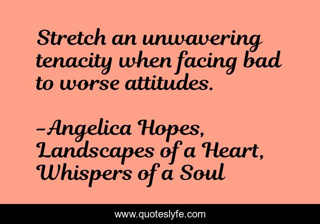 This page presents the quote "Stretch an unwavering tenacity when facing bad to worse attitudes.". Author of this quote is Angelica Hopes, Landscapes of a Heart, Whispers of a Soul. This quote is about envy, jealousy, crab-mentality, tenacity,.