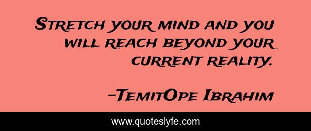 This page presents the quote "Stretch your mind and you will reach beyond your current reality.". Author of this quote is TemitOpe Ibrahim. This quote is about motivation, life-lessons, stretch, mind, reality, build, inspirational, enthusiasm, mind-shift,.