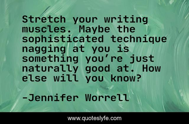 This page presents the quote "Stretch your writing muscles. Maybe the sophisticated technique nagging at you is something you’re just naturally good at. How else will you know?". Author of this quote is Jennifer Worrell. This quote is about writer-s-life, inspiration, writing,.