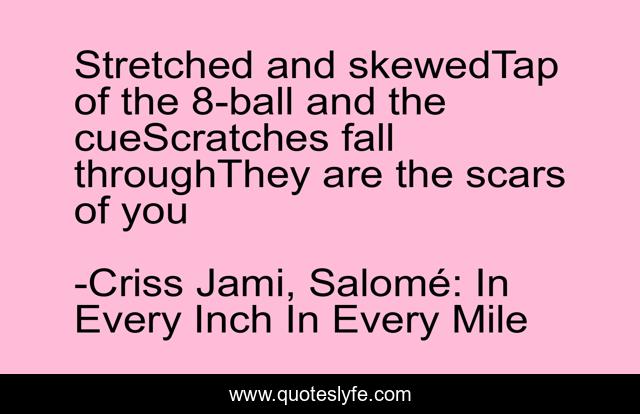 This page presents the quote "Stretched and skewedTap of the 8-ball and the cueScratches fall throughThey are the scars of you". Author of this quote is Criss Jami, Salomé: In Every Inch In Every Mile. This quote is about rhyming, love, lyrics, scratch, lies, stretched, cue-ball, metaphor, billiards,.