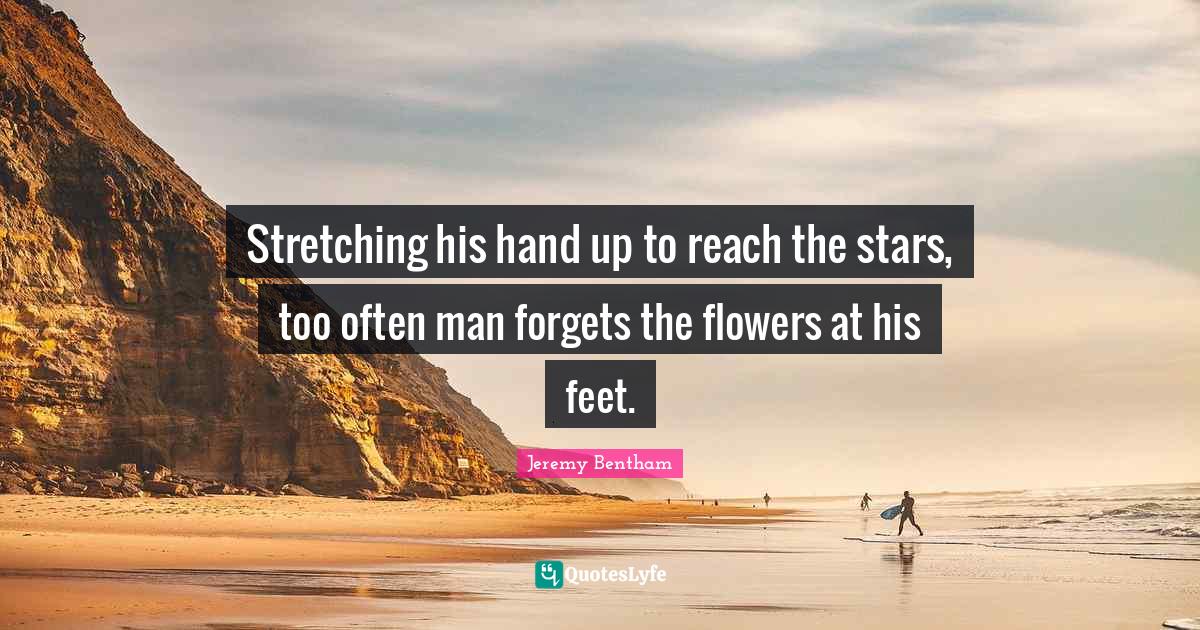 This page presents the quote "Stretching his hand up to reach the stars, too often man forgets the flowers at his feet.". Author of this quote is Jeremy Bentham. This quote is about feet, men, flower, stretching, stars,.
