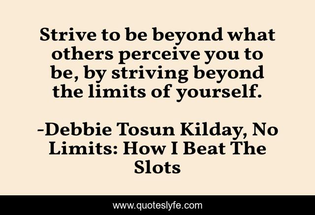 This page presents the quote "Strive to be beyond what others perceive you to be, by striving beyond the limits of yourself.". Author of this quote is Debbie Tosun Kilday, No Limits: How I Beat The Slots. This quote is about love, author, no-limits-how-i-beat-the-slots, debbie-tosun-kilday, books, creative-nonfiction, gambling, writers, affection,.