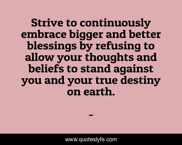 This page presents the quote "Strive to continuously embrace bigger and better blessings by refusing to allow your thoughts and beliefs to stand against you and your true destiny on earth.". Author of this quote is . This quote is about edmond-mbiaka, your-thoughts-and-president, your-true-destiny, strive-to-achieve-better-things, destiny-on-earth,.