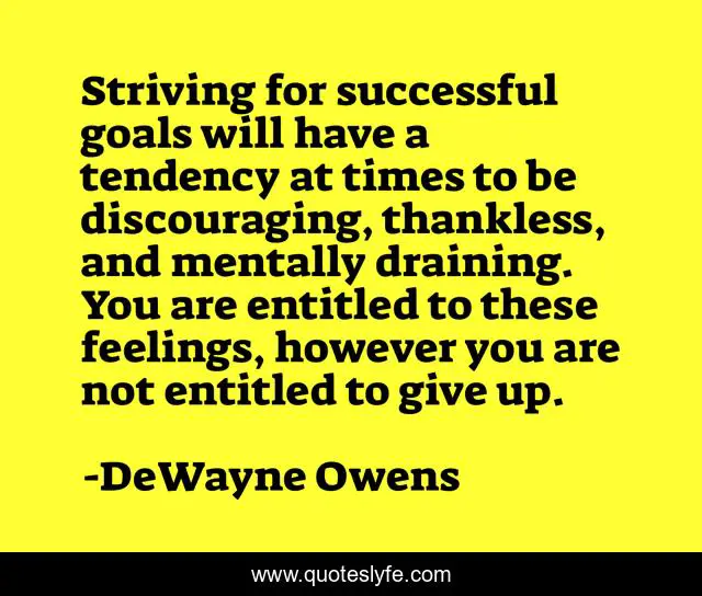 This page presents the quote "Striving for successful goals will have a tendency at times to be discouraging, thankless, and mentally draining. You are entitled to these feelings, however you are not entitled to give up.". Author of this quote is DeWayne Owens. This quote is about quitting, life, success, goals-in-life, leadership-development, inspirational, giving-up-on-yourself, motivational, confidence,.