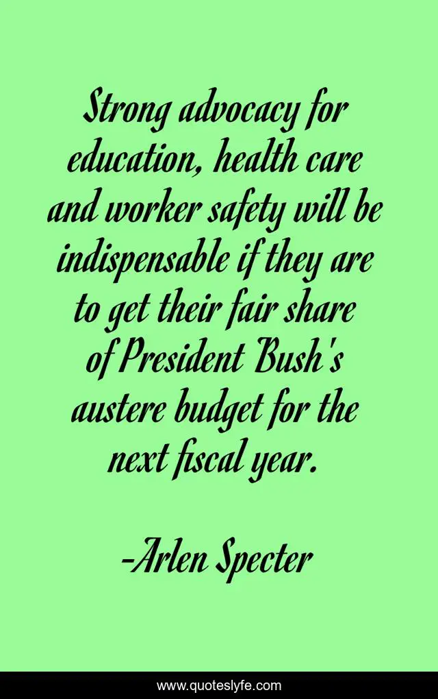 This page presents the quote "Strong advocacy for education, health care and worker safety will be indispensable if they are to get their fair share of President Bush's austere budget for the next fiscal year.". Author of this quote is Arlen Specter. This quote is about education, safety, strong,.