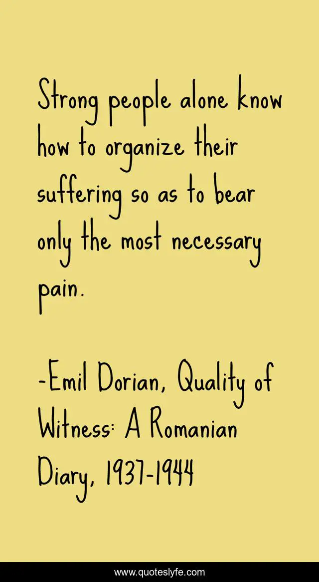 This page presents the quote "Strong people alone know how to organize their suffering so as to bear only the most necessary pain.". Author of this quote is Emil Dorian, Quality of Witness: A Romanian Diary, 1937-1944. This quote is about fortitude, suffering, strength, resilience,.