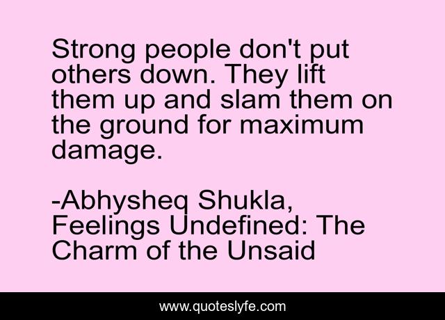 "Abhysheq Shukla, Feelings Undefined: The Charm of the Unsaid Quotes." Quoteslyfe.com, 2025. Fri. 05 Dec. 2025. <https://www.quoteslyfe.com/quote/Strong-people-don-t-put-others-down-34096>.