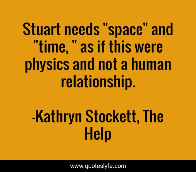This page presents the quote "Stuart needs "space" and "time, " as if this were physics and not a human relationship.". Author of this quote is Kathryn Stockett, The Help. This quote is about breakup, heartbreak, relationship, space,.