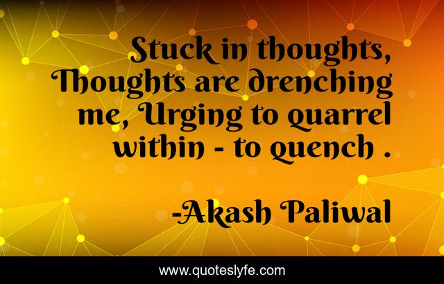 This page presents the quote "Stuck in thoughts, Thoughts are drenching me, Urging to quarrel within - to quench .". Author of this quote is Akash Paliwal. This quote is about enthusiasm, life, inspirational,.