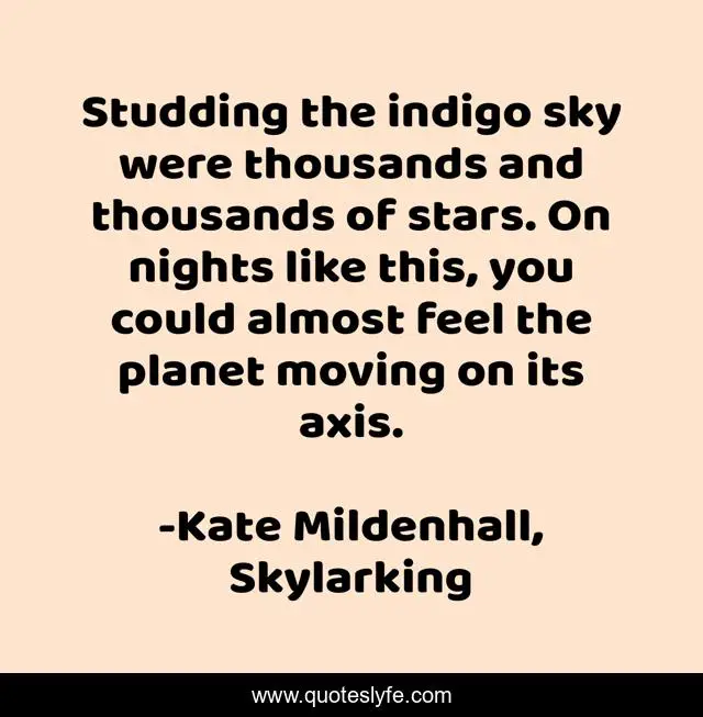 "Kate Mildenhall, Skylarking Quotes." Quoteslyfe.com, 2025. Tue. 09 Dec. 2025. <https://www.quoteslyfe.com/quote/Studding-the-indigo-sky-were-thousands-and-169724>.