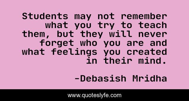 This page presents the quote "Students may not remember what you try to teach them, but they will never forget who you are and what feelings you created in their mind.". Author of this quote is Debasish Mridha. This quote is about life, education, love, knowledge, students, intelligence, create, philosophy, mind,.