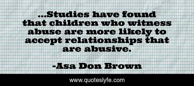 This page presents the quote "...Studies have found that children who witness abuse are more likely to accept relationships that are abusive.". Author of this quote is Asa Don Brown. This quote is about abused, domestic-abuse, the-sober-world-magazine, abusive, abuse, addict, addiction, dr-asa-don-brown, addictive,.