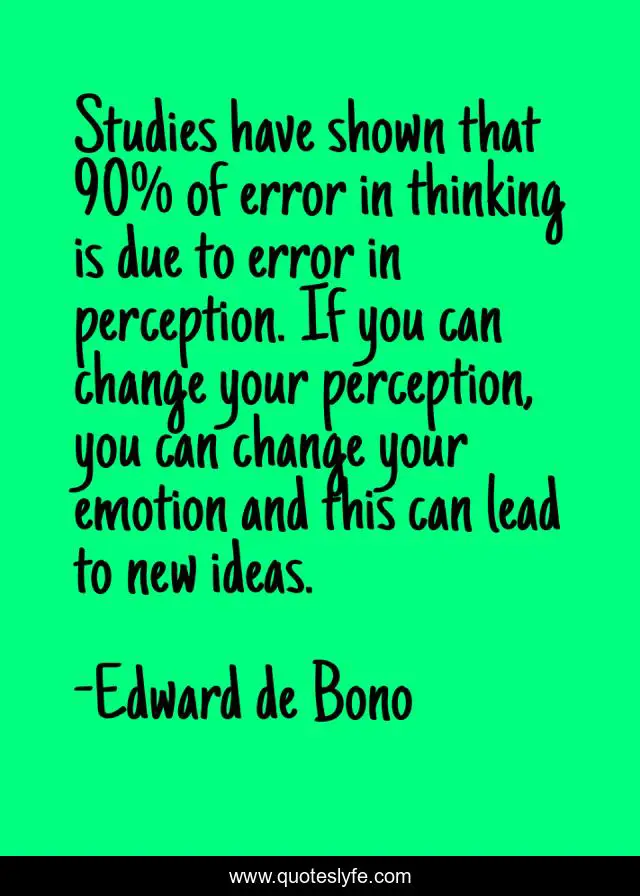 This page presents the quote "Studies have shown that 90% of error in thinking is due to error in perception. If you can change your perception, you can change your emotion and this can lead to new ideas.". Author of this quote is Edward de Bono. This quote is about thinking, perception, ideas,.