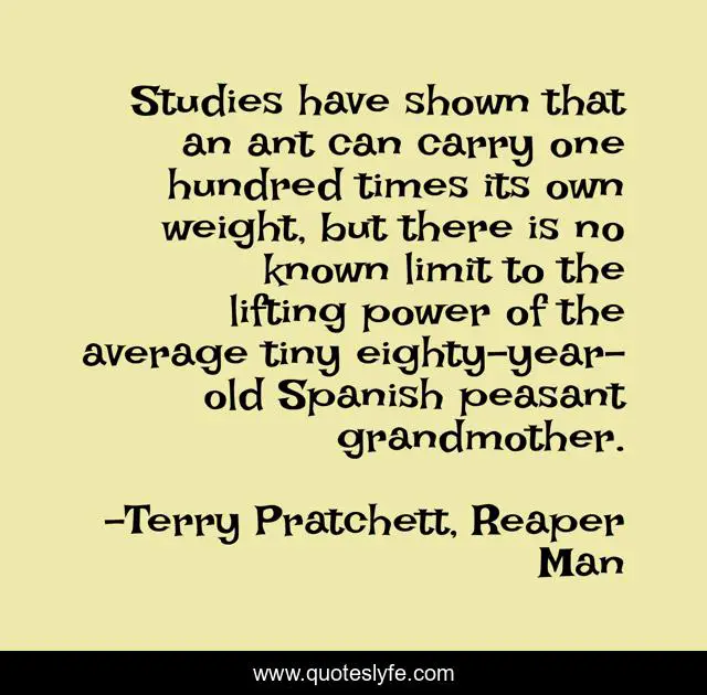 This page presents the quote "Studies have shown that an ant can carry one hundred times its own weight, but there is no known limit to the lifting power of the average tiny eighty-year-old Spanish peasant grandmother.". Author of this quote is Terry Pratchett, Reaper Man. .