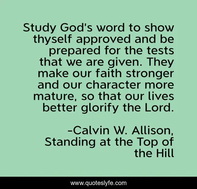 This page presents the quote "Study God’s word to show thyself approved and be prepared for the tests that we are given. They make our faith stronger and our character more mature, so that our lives better glorify the Lord.". Author of this quote is Calvin W. Allison, Standing at the Top of the Hill. This quote is about bible-study, bible, diligence,.