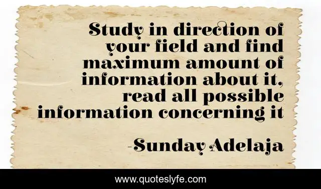 This page presents the quote "Study in direction of your field and find maximum amount of information about it, read all possible information concerning it". Author of this quote is Sunday Adelaja. This quote is about information, direction, read, study, life, maximum, field, purpose, learn,.