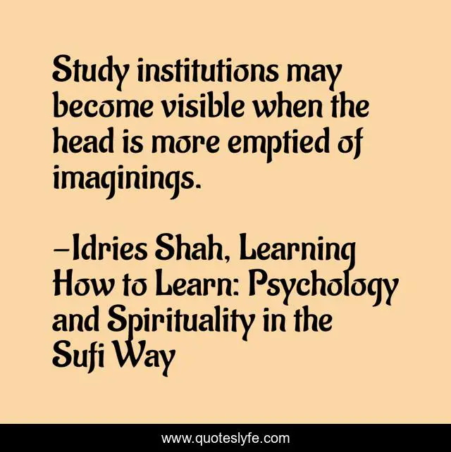 This page presents the quote "Study institutions may become visible when the head is more emptied of imaginings.". Author of this quote is Idries Shah, Learning How to Learn: Psychology and Spirituality in the Sufi Way. This quote is about automatism, sufi, sufism, conditioning, learning, sufis, gurdjieff,.