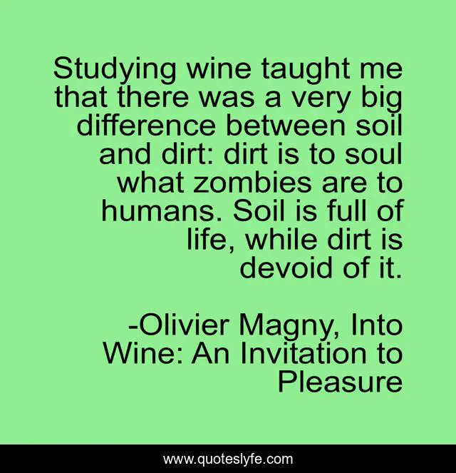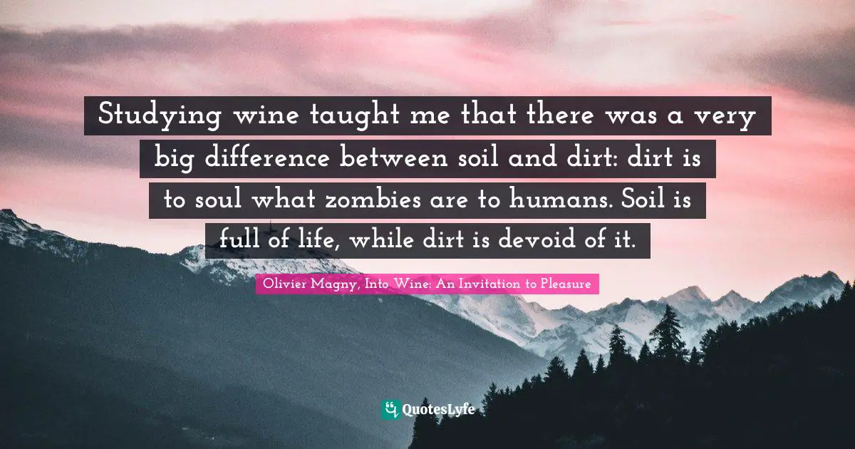 This page presents the quote "Studying wine taught me that there was a very big difference between soil and dirt: dirt is to soul what zombies are to humans. Soil is full of life, while dirt is devoid of it.". Author of this quote is Olivier Magny, Into Wine: An Invitation to Pleasure. This quote is about analogy, dirt, soil, zombies, farming, wine,.