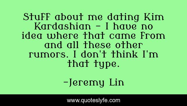 This page presents the quote "Stuff about me dating Kim Kardashian - I have no idea where that came from and all these other rumors. I don't think I'm that type.". Author of this quote is Jeremy Lin. This quote is about me, think, idea,.