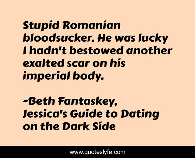 This page presents the quote "Stupid Romanian bloodsucker. He was lucky I hadn't bestowed another exalted scar on his imperial body.". Author of this quote is Beth Fantaskey, Jessica's Guide to Dating on the Dark Side. This quote is about funny, bloodsuckers, comedy, vampire,.