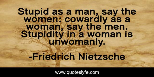 This page presents the quote "Stupid as a man, say the women: cowardly as a woman, say the men. Stupidity in a woman is unwomanly.". Author of this quote is Friedrich Nietzsche. This quote is about woman, men, man,.