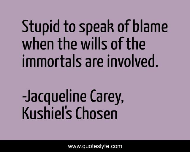 This page presents the quote "Stupid to speak of blame when the wills of the immortals are involved.". Author of this quote is Jacqueline Carey, Kushiel's Chosen. This quote is about blame, gods, stupid, immortal,.