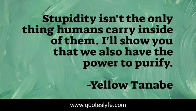 This page presents the quote "Stupidity isn't the only thing humans carry inside of them. I'll show you that we also have the power to purify.". Author of this quote is Yellow Tanabe. This quote is about impact, strength, power, humans, qualities, man,.