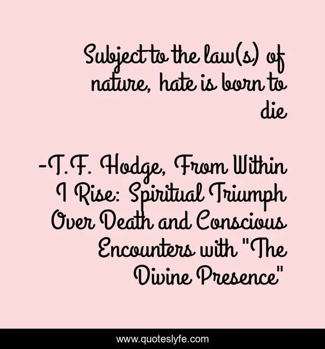 This page presents the quote "Subject to the law(s) of nature, hate is born to die". Author of this quote is T.F. Hodge, From Within I Rise: Spiritual Triumph Over Death and Conscious Encounters with "The Divine Presence". This quote is about confidence, force, nature, positive, energy, negative, emotions, birth, quotes-to-live-by,.