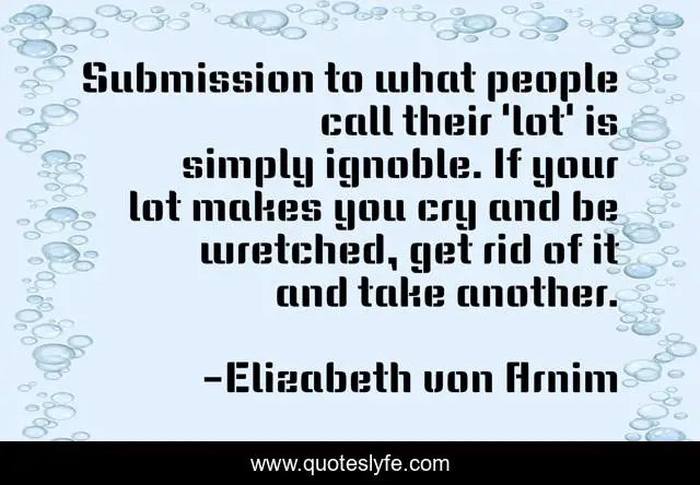 This page presents the quote "Submission to what people call their 'lot' is simply ignoble. If your lot makes you cry and be wretched, get rid of it and take another.". Author of this quote is Elizabeth von Arnim. This quote is about confidence, positive, motivational, optimistic, inspirational, enthusiasm,.
