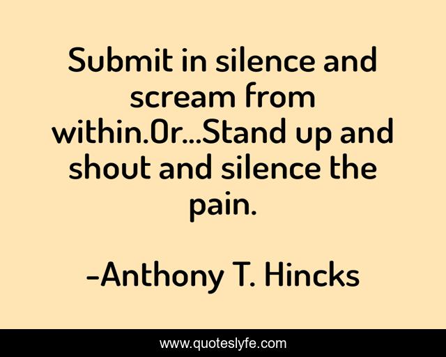 This page presents the quote "Submit in silence and scream from within.Or...Stand up and shout and silence the pain.". Author of this quote is Anthony T. Hincks. This quote is about silence, life, philosophy, pain, within, submit, shout, stand, scream,.