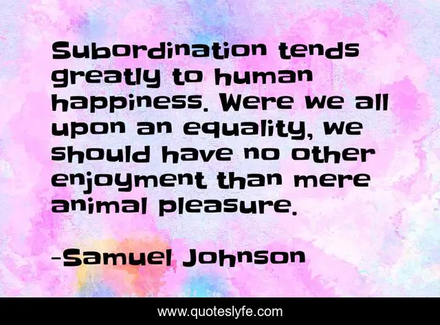 This page presents the quote "Subordination tends greatly to human happiness. Were we all upon an equality, we should have no other enjoyment than mere animal pleasure.". Author of this quote is Samuel Johnson. This quote is about happiness, animal, human,.