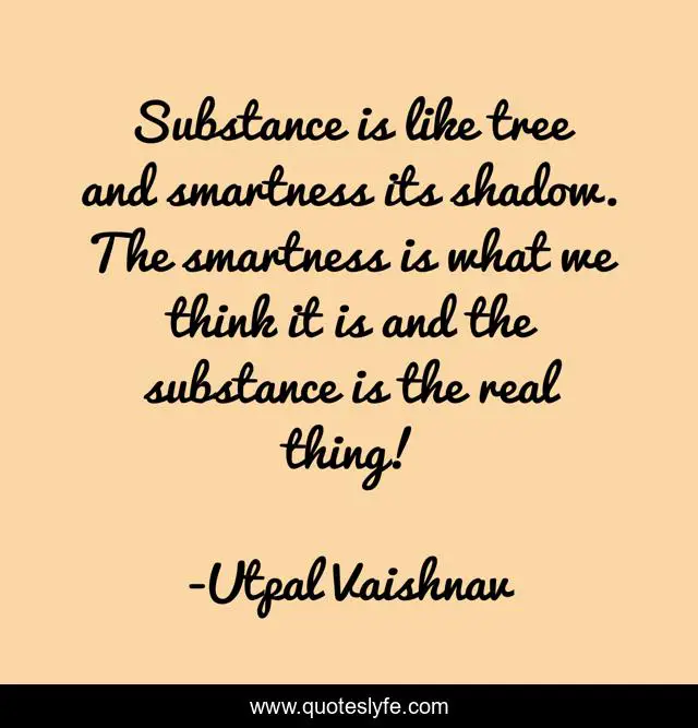 This page presents the quote "Substance is like tree and smartness its shadow. The smartness is what we think it is and the substance is the real thing!". Author of this quote is Utpal Vaishnav. This quote is about confidence, smartness, positive, motivational, character, substance, optimistic, inspirational, enthusiasm,.