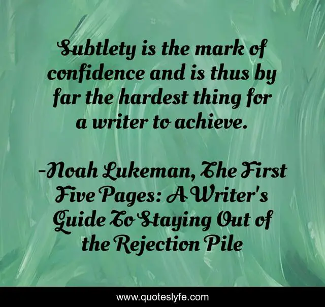 This page presents the quote "Subtlety is the mark of confidence and is thus by far the hardest thing for a writer to achieve.". Author of this quote is Noah Lukeman, The First Five Pages: A Writer's Guide To Staying Out of the Rejection Pile. This quote is about writing, confidence, writing-confidence, subtlety, writing-tips,.