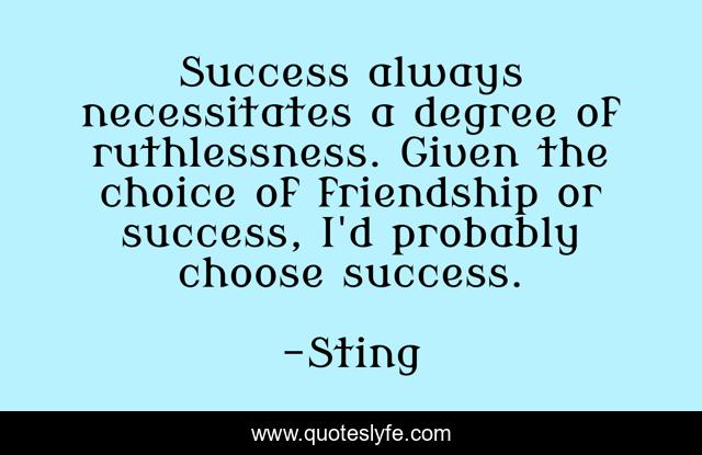 This page presents the quote "Success always necessitates a degree of ruthlessness. Given the choice of friendship or success, I'd probably choose success.". Author of this quote is Sting. This quote is about always, success, choice,.