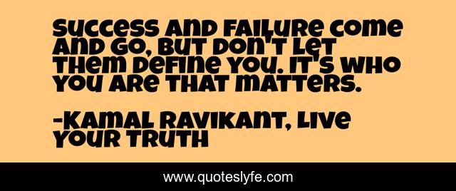 This page presents the quote "Success and failure come and go, but don't let them define you. It's who you are that matters.". Author of this quote is Kamal Ravikant, Live Your Truth. This quote is about success, entrepreneurship, failure, courage, self-improvement, resilience,.