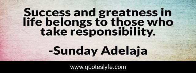 This page presents the quote "Success and greatness in life belongs to those who take responsibility.". Author of this quote is Sunday Adelaja. This quote is about responsibility, success, greatness,.