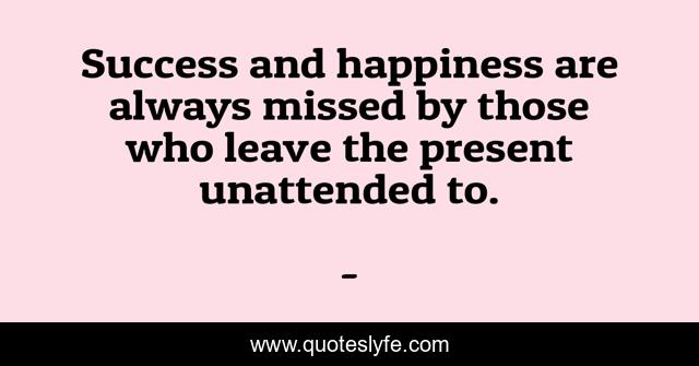 This page presents the quote "Success and happiness are always missed by those who leave the present unattended to.". Author of this quote is . This quote is about being-happy, living-in-the-present, success, edmond-mbiaka, attending-to-the-present, successful, the-present, attend-to-your-present, happiness,.