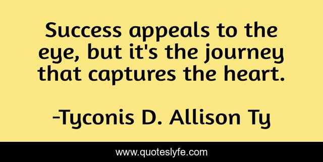 This page presents the quote "Success appeals to the eye, but it's the journey that captures the heart.". Author of this quote is Tyconis D. Allison Ty. This quote is about life, positive, motivational, confidence, optimistic, inspirational, enthusiasm,.