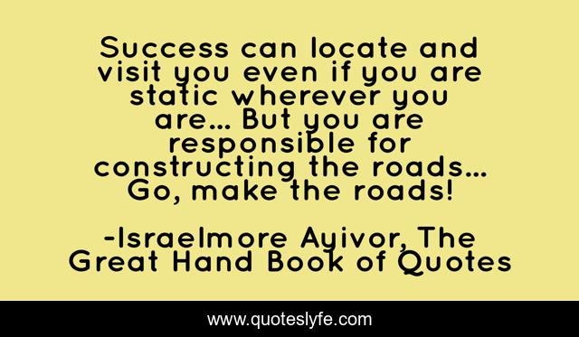 This page presents the quote "Success can locate and visit you even if you are static wherever you are... But you are responsible for constructing the roads... Go, make the roads!". Author of this quote is Israelmore Ayivor, The Great Hand Book of Quotes. This quote is about locate, begin, constructing, success, take-a-step, responsible, make-the-roads, food-for-thought, start,.