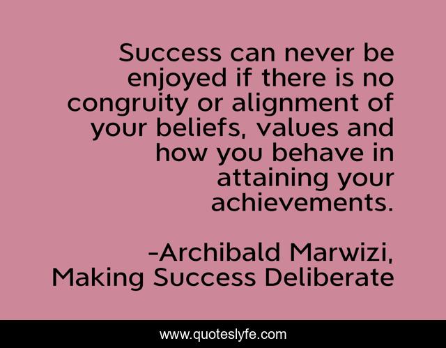 This page presents the quote "Success can never be enjoyed if there is no congruity or alignment of your beliefs, values and how you behave in attaining your achievements.". Author of this quote is Archibald Marwizi, Making Success Deliberate. This quote is about life, success, behaviour, attitude, legacy, growth, purpose, inspirational, leadership,.