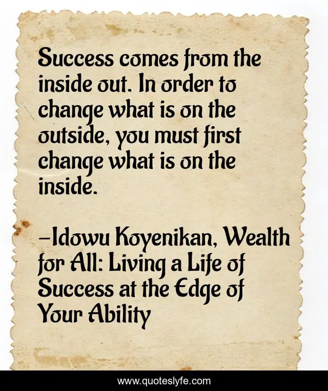 "Idowu Koyenikan, Wealth for All: Living a Life of Success at the Edge of Your Ability Quotes." Quoteslyfe.com, 2025. Sun. 07 Dec. 2025. <https://www.quoteslyfe.com/quote/Success-comes-from-the-inside-out-In-106373>.