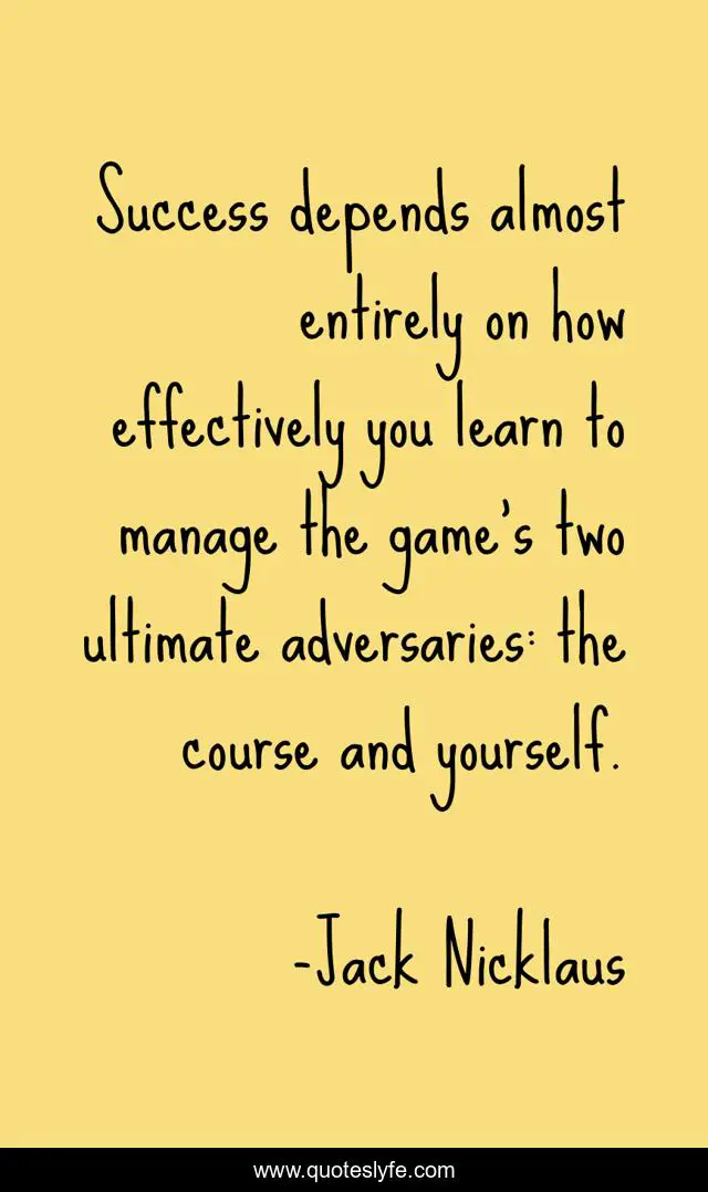 This page presents the quote "Success depends almost entirely on how effectively you learn to manage the game's two ultimate adversaries: the course and yourself.". Author of this quote is Jack Nicklaus. This quote is about game, yourself,.