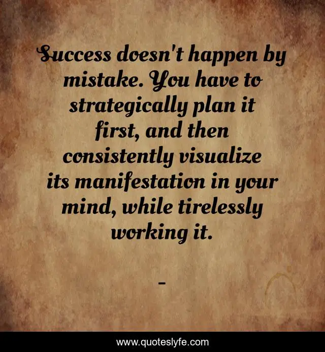 Success doesn't happen by mistake. You have to strategically plan it first, and then consistently visualize its manifestation in your mind, while tirelessly working it.