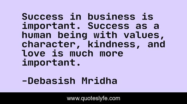 This page presents the quote "Success in business is important. Success as a human being with values, character, kindness, and love is much more important.". Author of this quote is Debasish Mridha. This quote is about miraboli, love, success, oscar-wilde, debasish-mridha, philosophy, character, gandhi, quotes,.